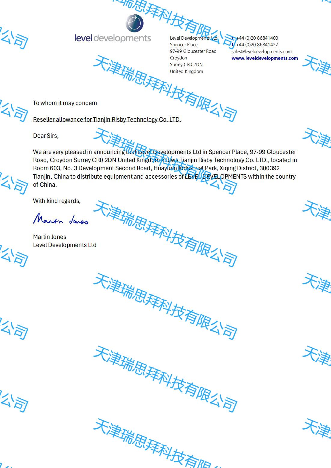 天津瑞思拜科技有限公司(以下簡稱“瑞思拜”)欣然宣布,正式成為英國Level Developments的授權代理商。這一重要合作將進一步拓展瑞思拜在高科技領域的業務,并為中國市場帶來更多創新和優質的產品解決方案。