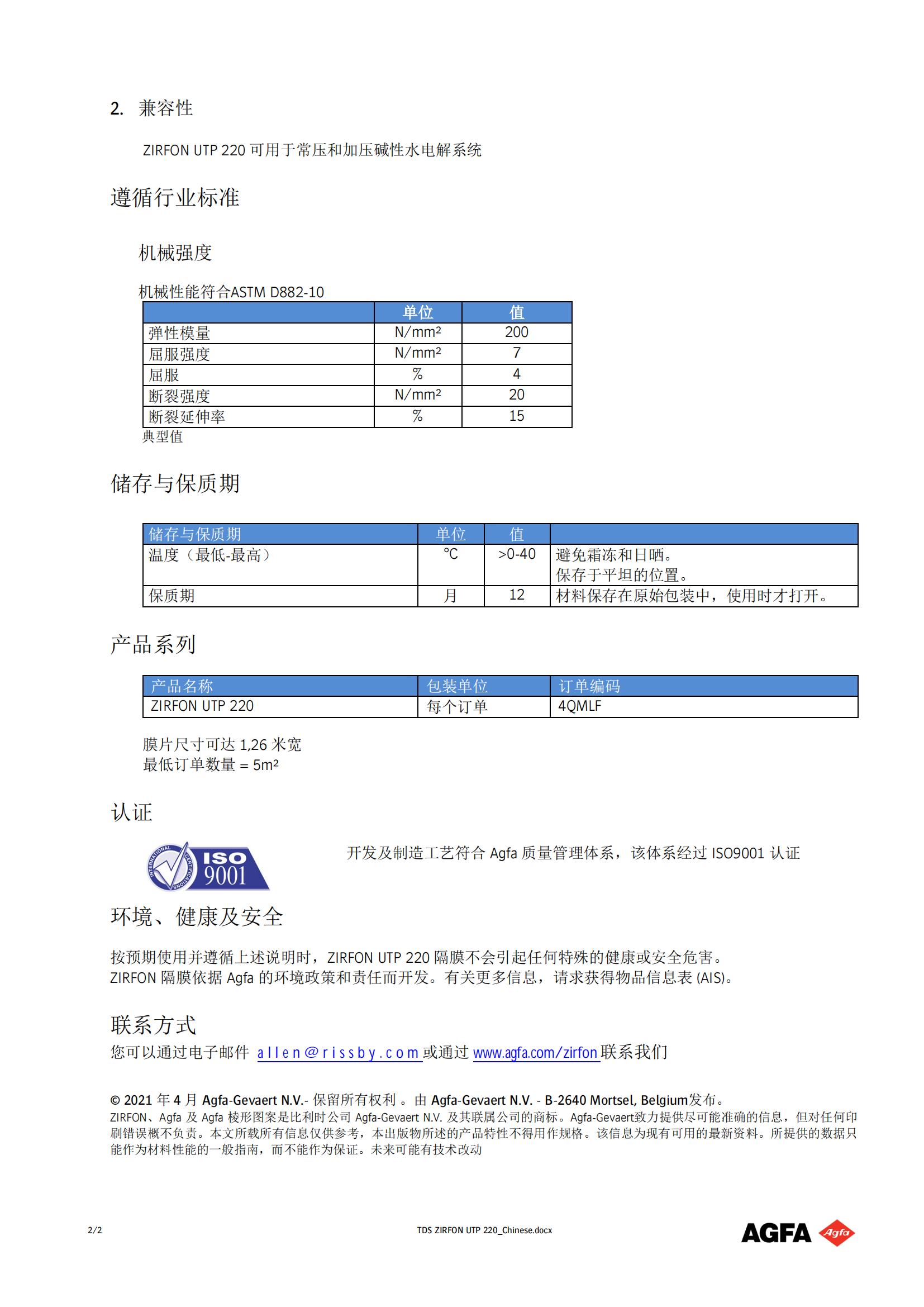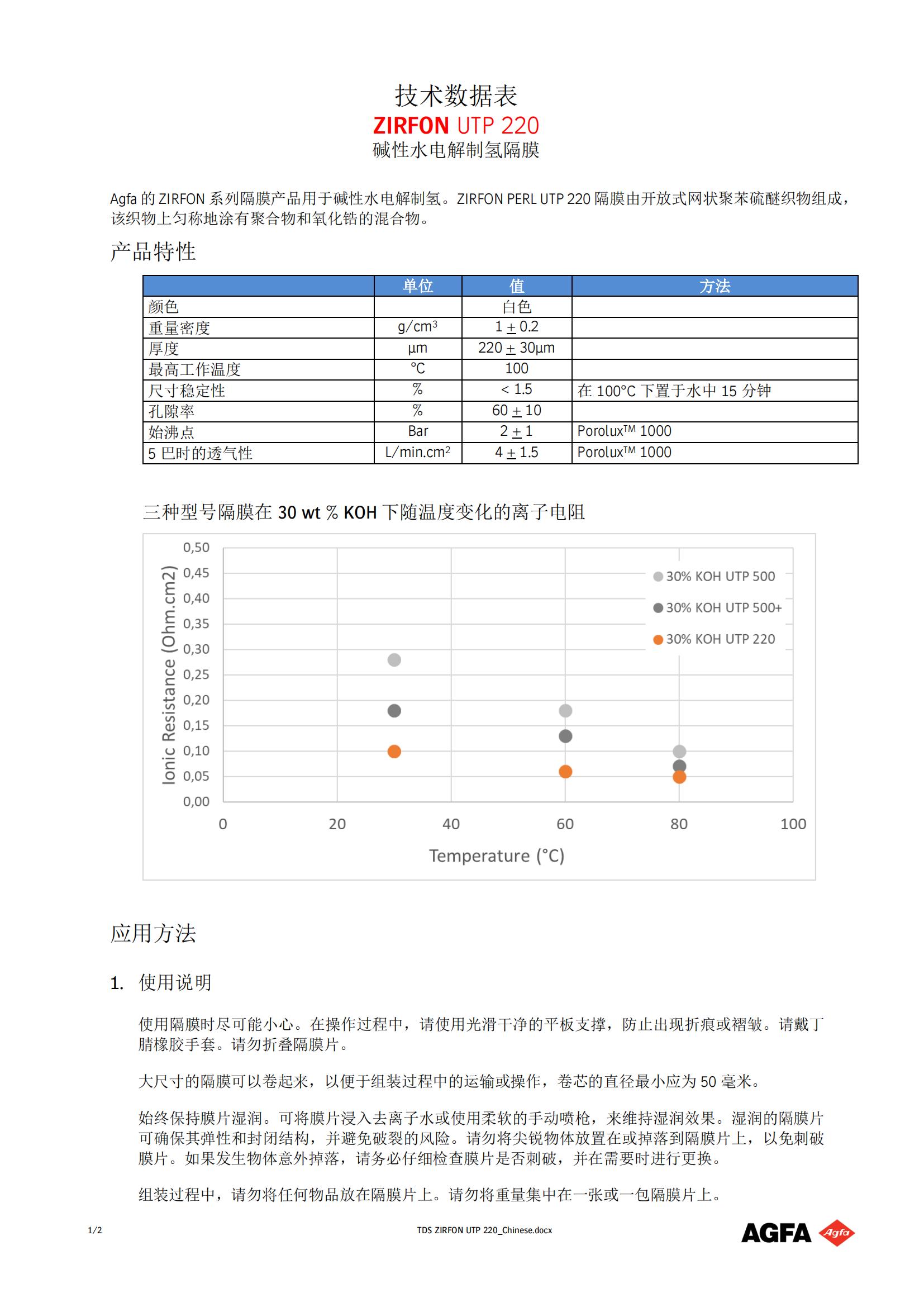2021 年 5 月 5 日,AGFA推出用于生產綠色氫氣的高性能 ZIRFON UTP 220 膜。